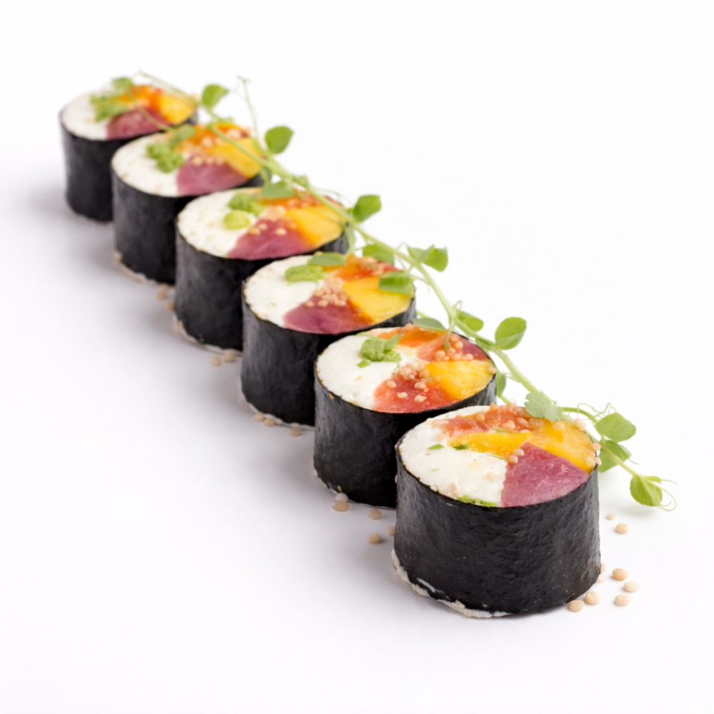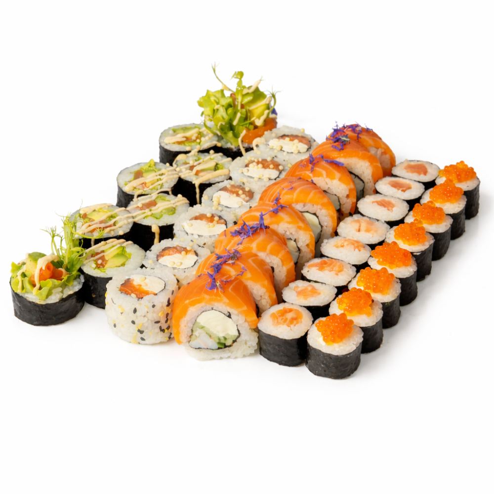 •Ебі Салмон•Туна Грін•Манго Унаги•Філадельфія класік з лососем•Макі з червоною ікрою•Нігірі від шефа 4шт