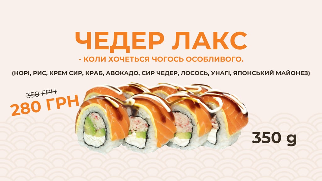 • Філадельфія карамель• Авокадо рол• Філадельфія з тунцем• Філадельфія чеддер• Макі з лососем• Макі з огірком